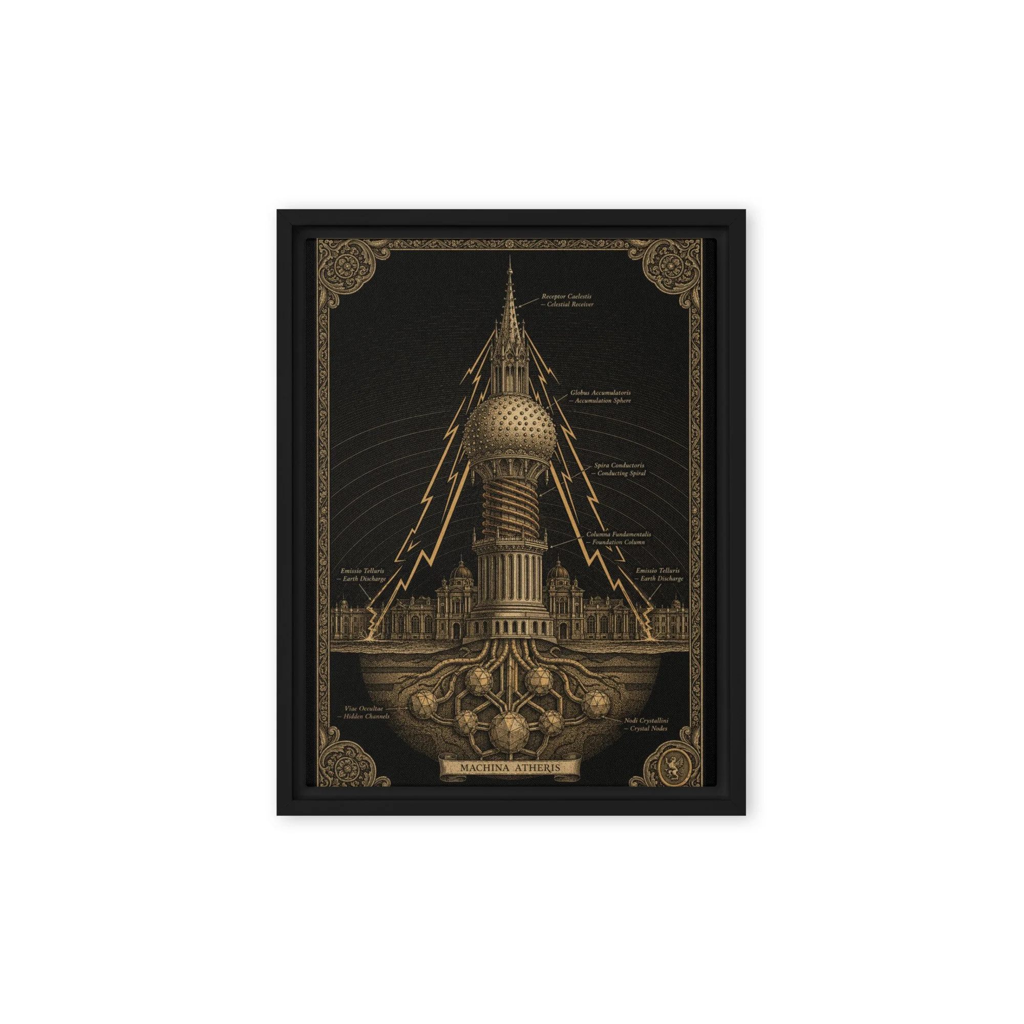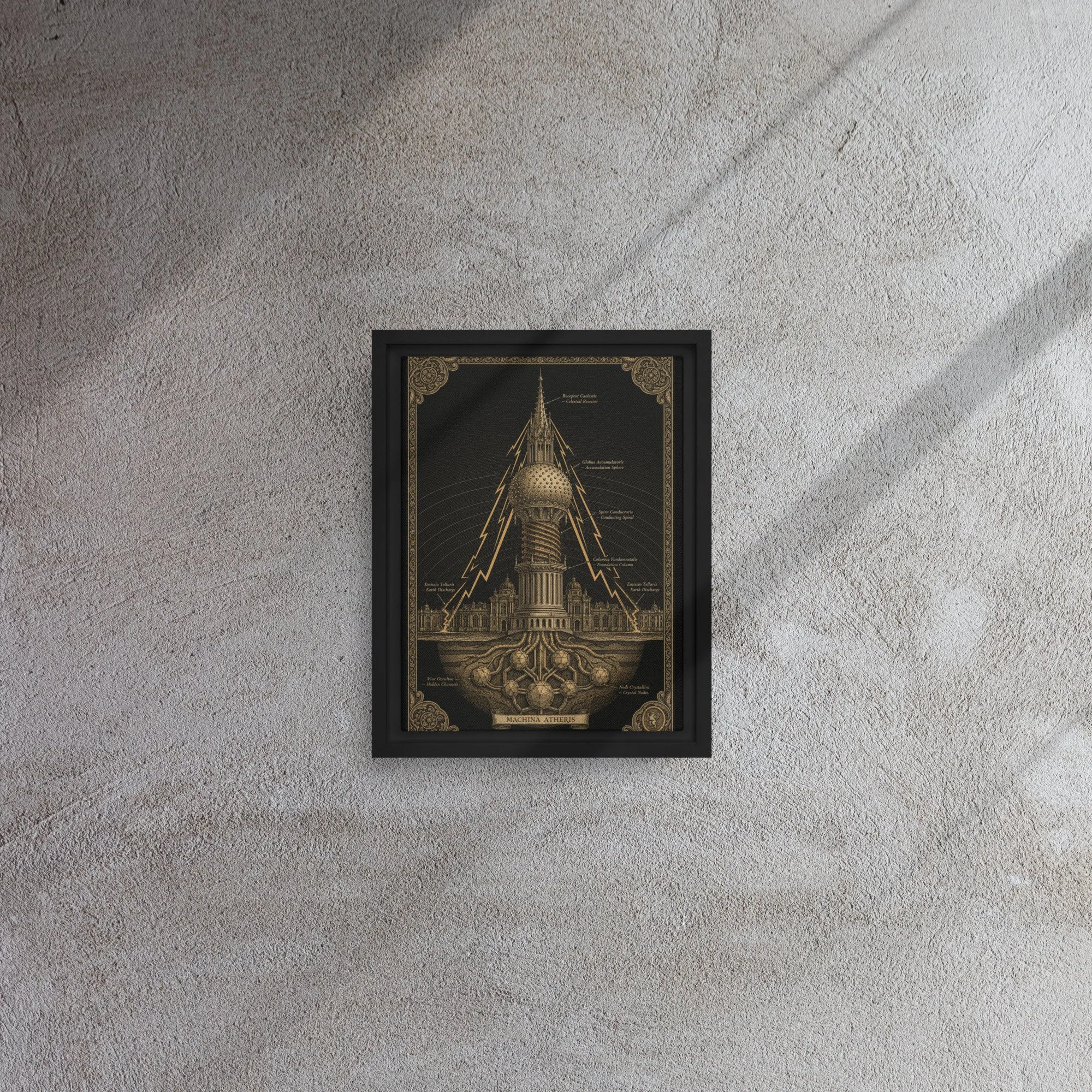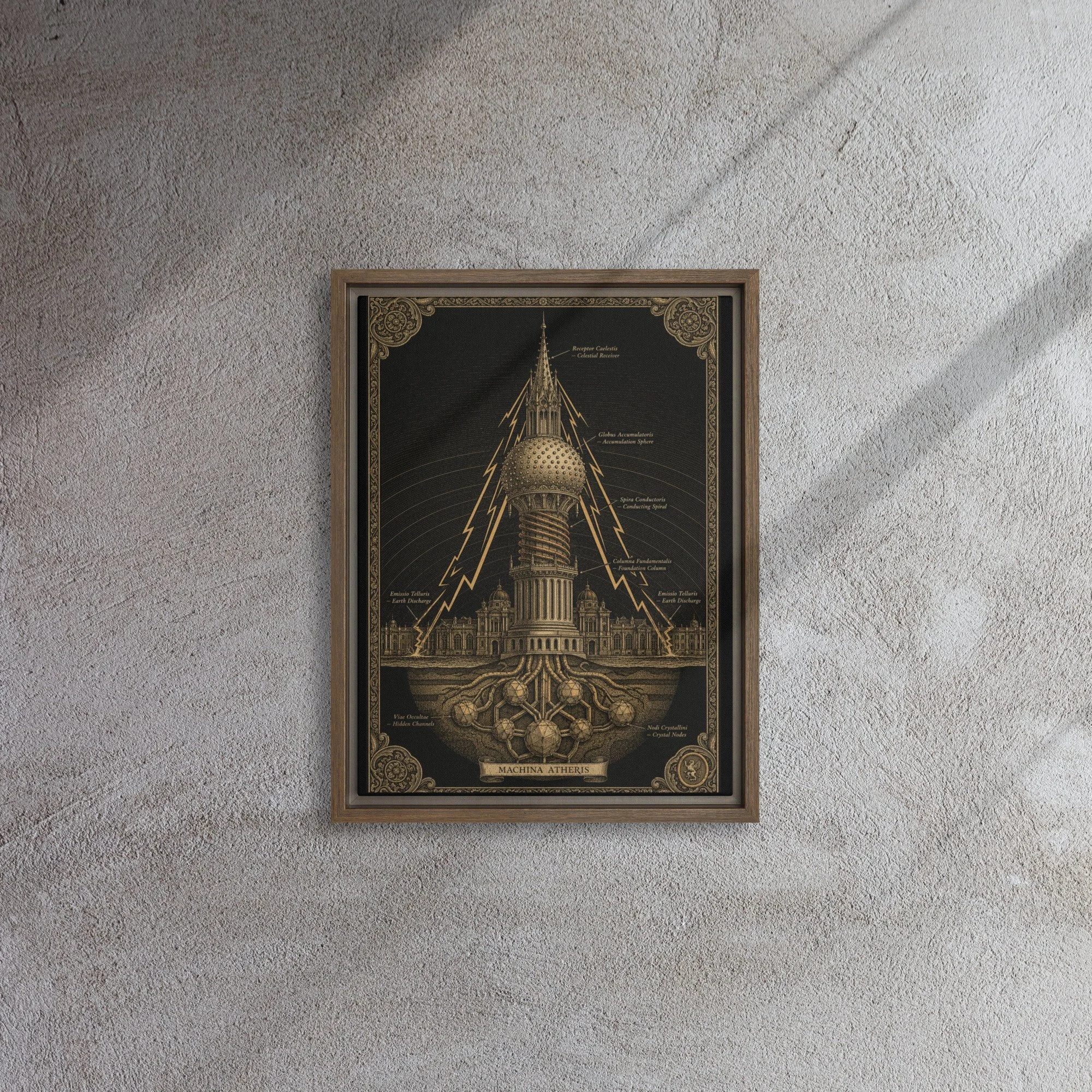 Printed on gallery-weight canvas and set in a solid pine float frame, this piece is designed to be read as well as seen. The Latin annotations reward proximity. The architecture rewards patience.
