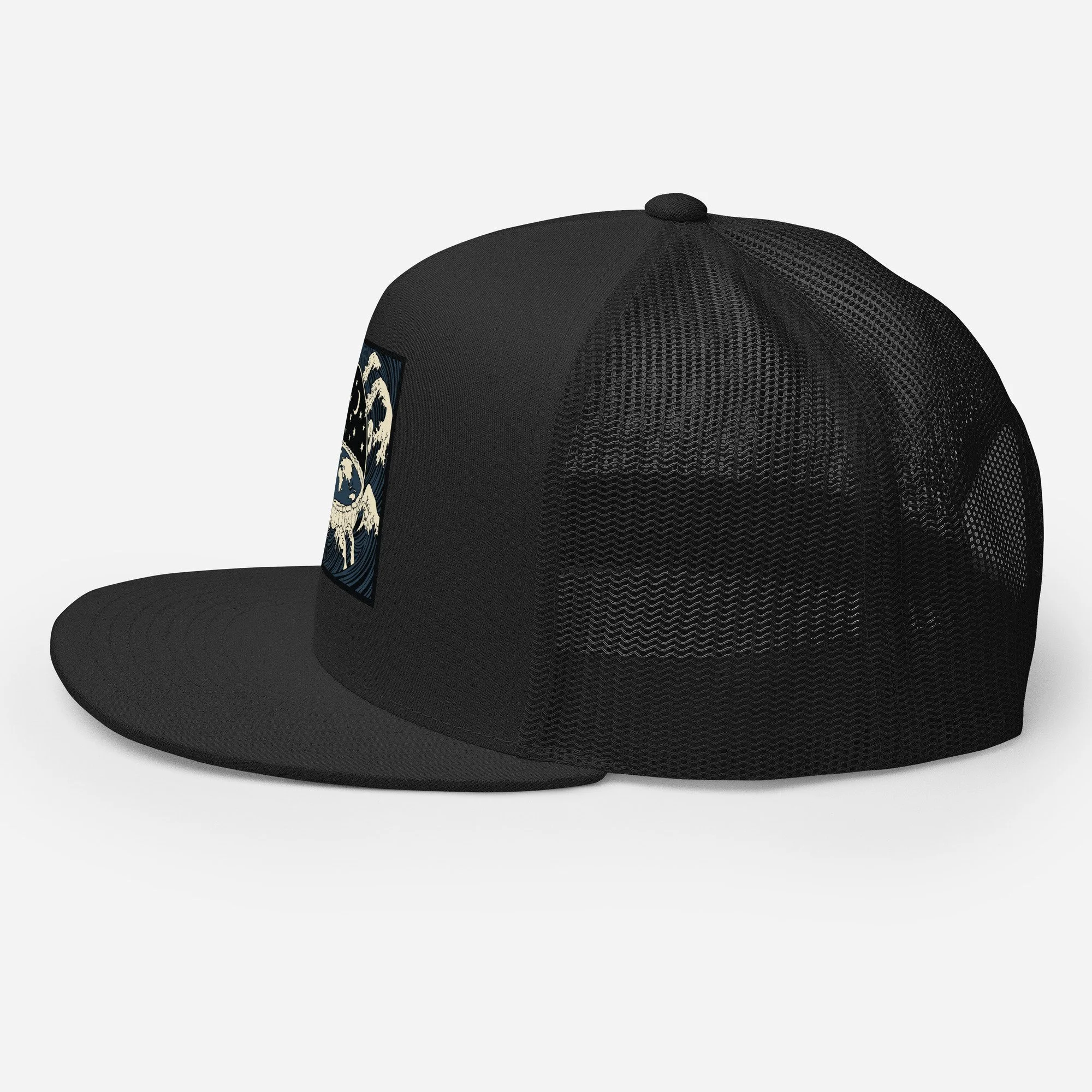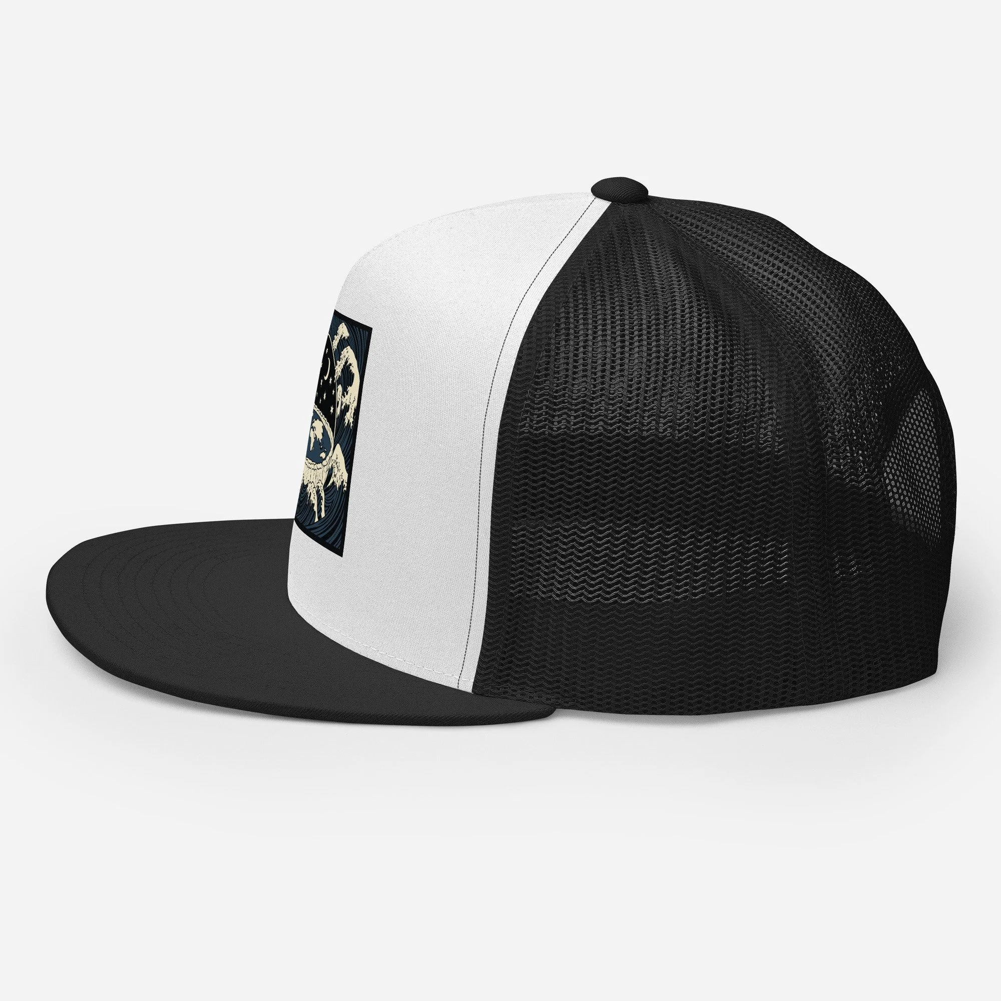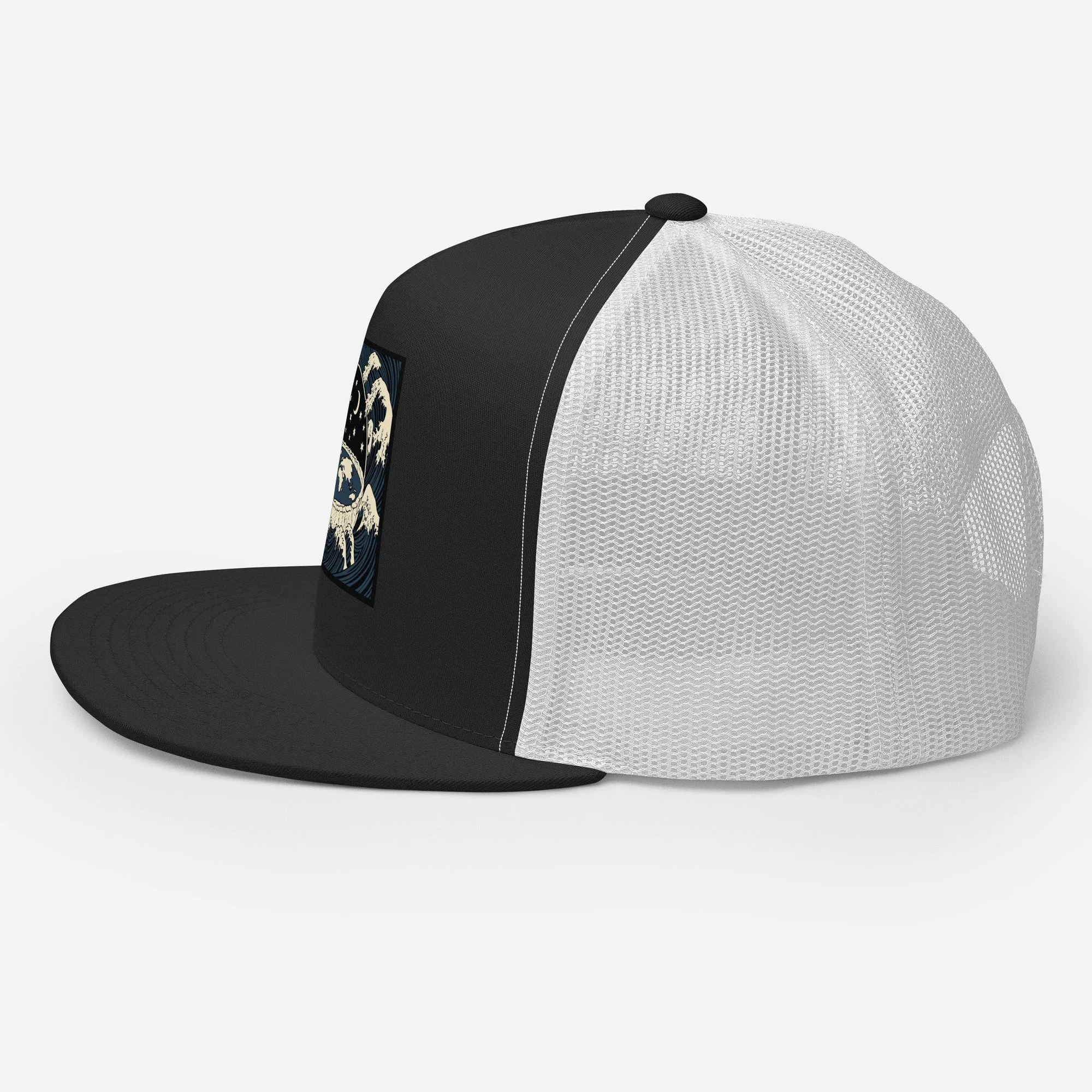 Classic trucker cap style with a cool fabric blend. A celestial hat inspired by the waters above—the great sea beyond the firmament, suspended over the world below. The design brings together wave, dome, earth, sun, moon, and stars in a symbolic composition that speaks to old cosmologies, sacred order, and the mirrored relationship between realms: as above, so below.